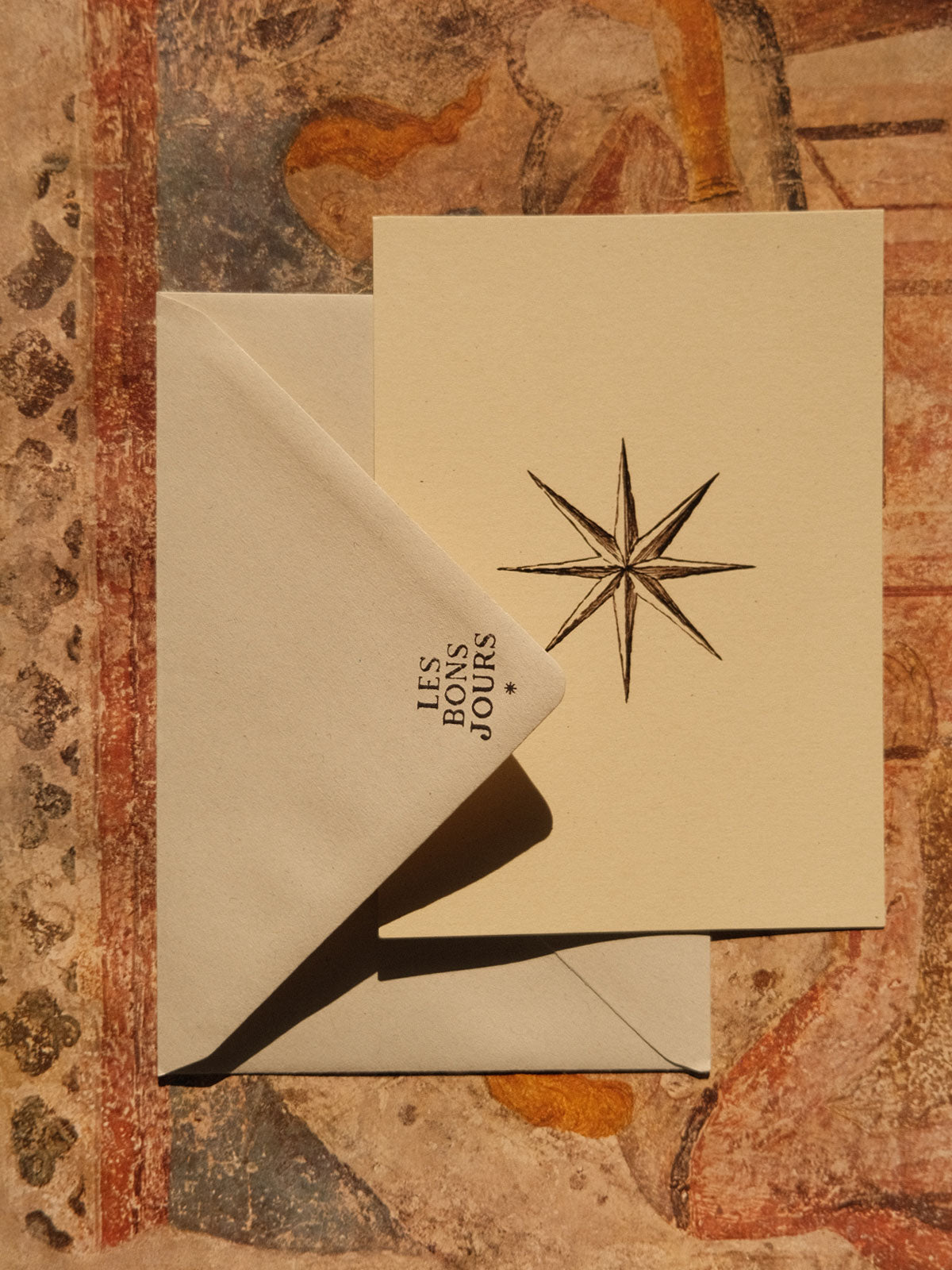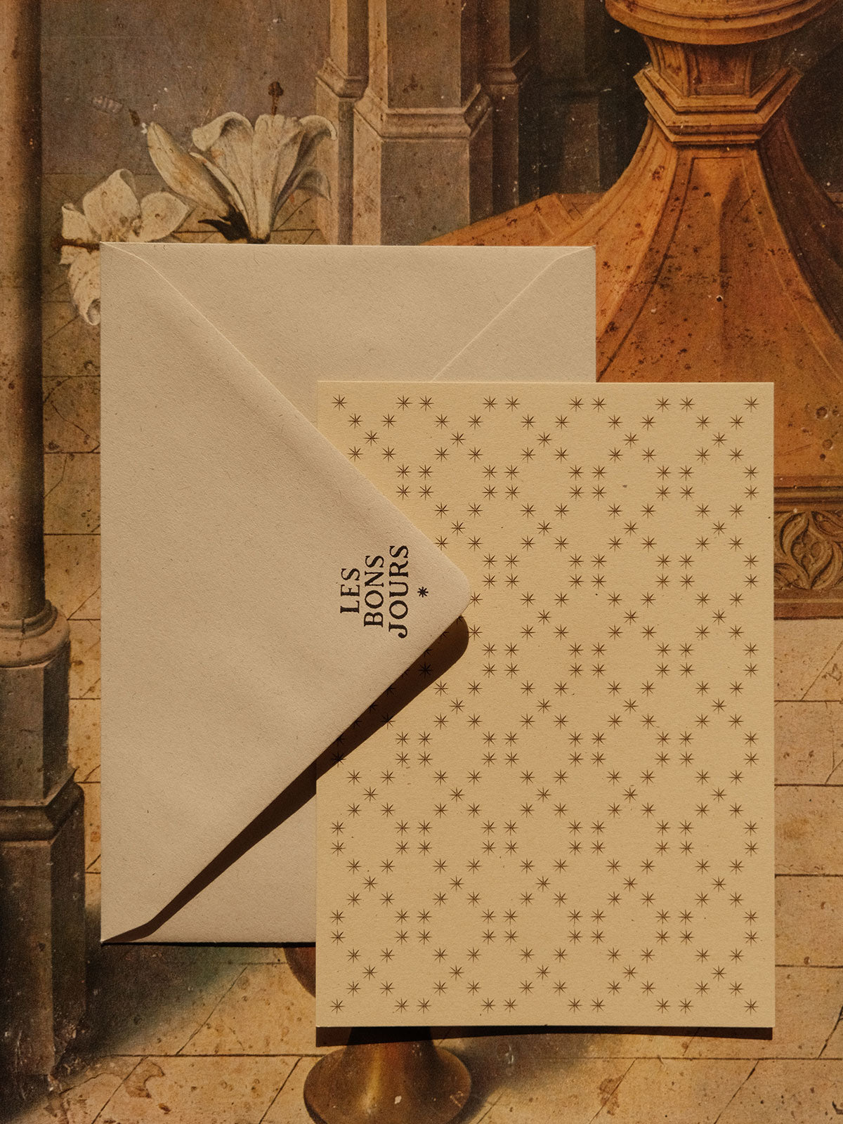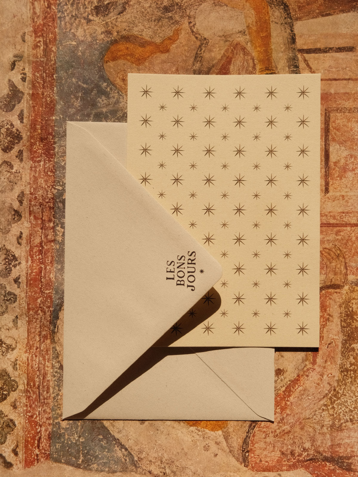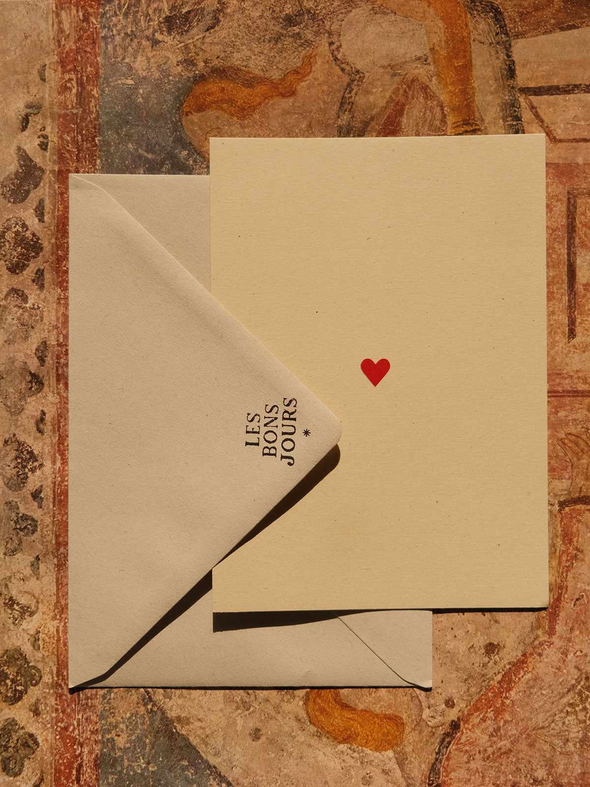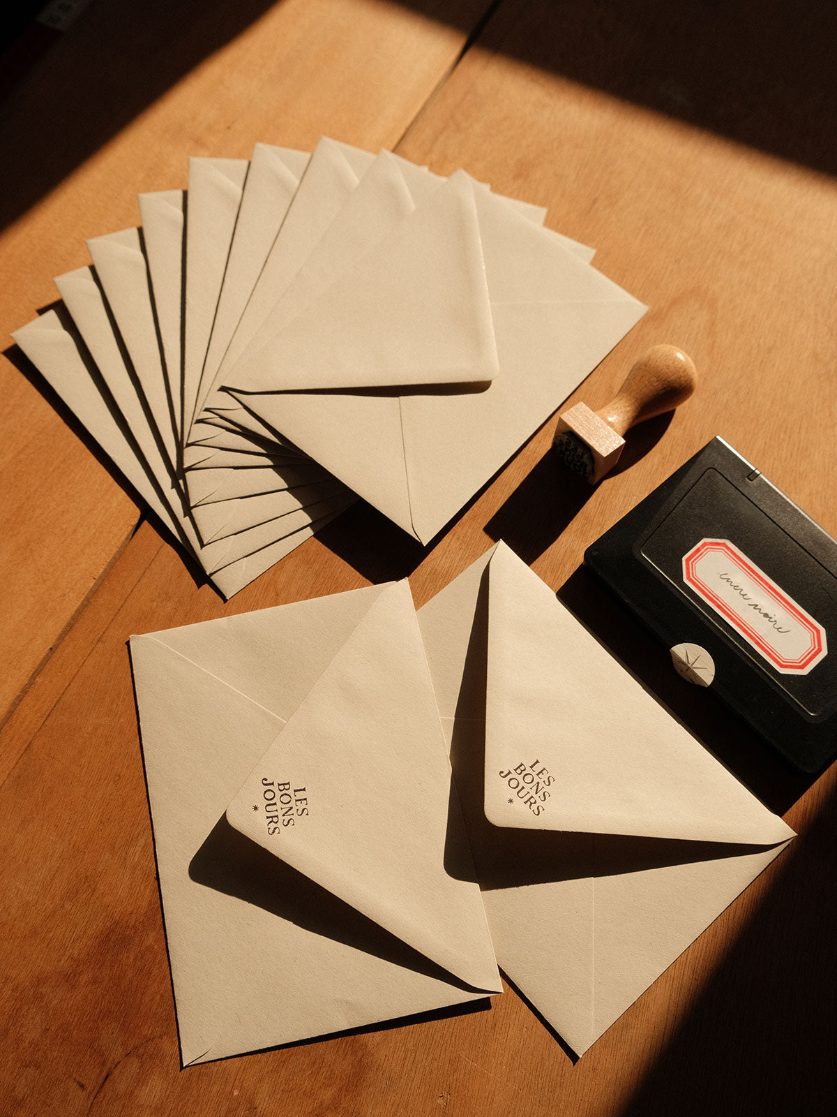 Chaque carte est accompagnée d'une enveloppe 100% recyclée couleur lin, fabriquée en Provence et tamponnée Les Bons Jours à l'atelier à la main.