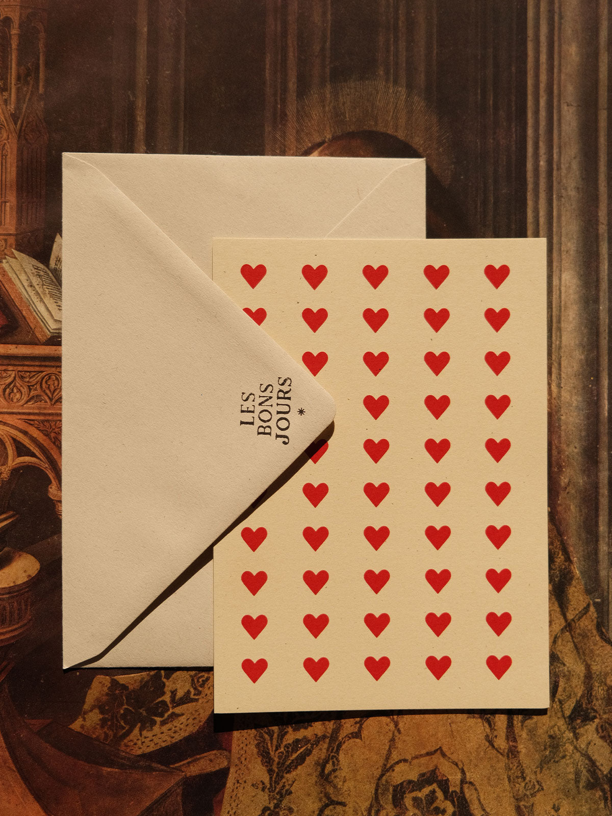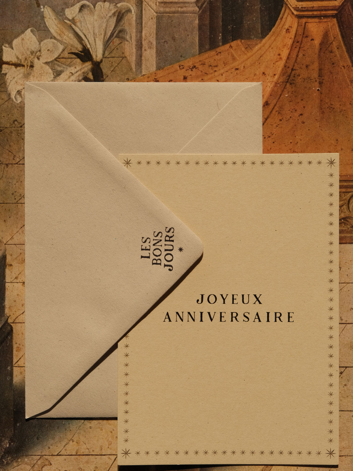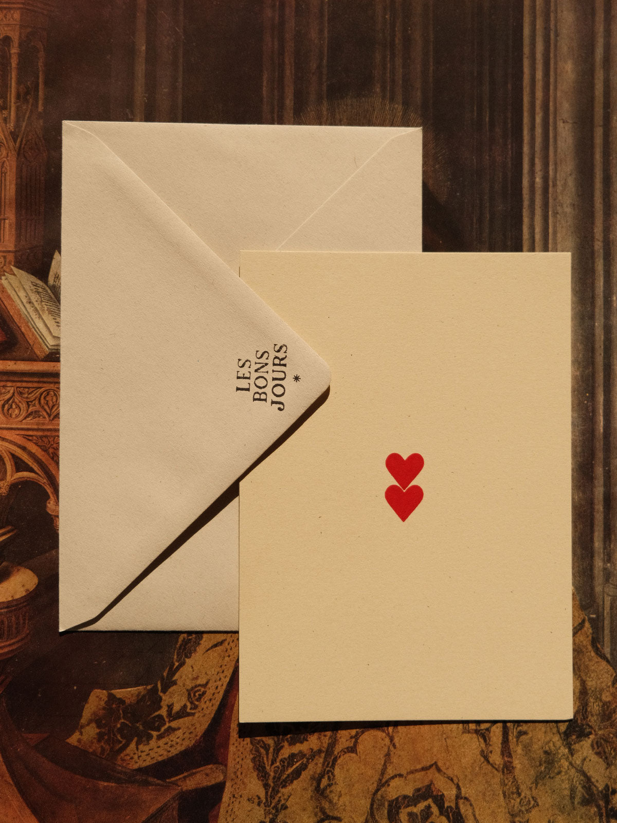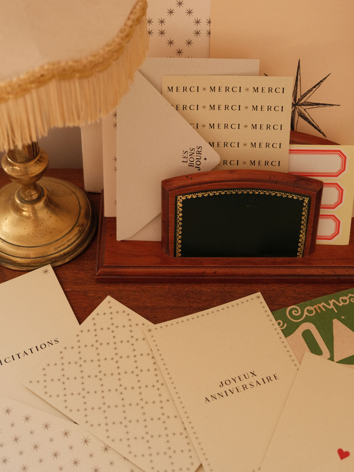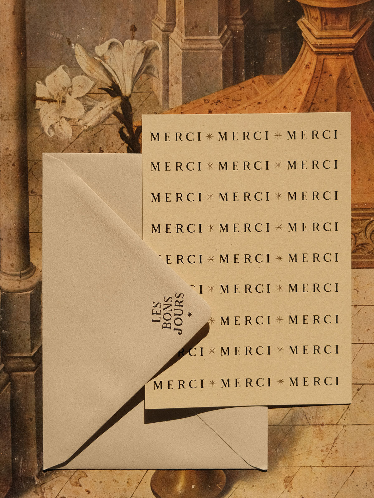 Chaque carte est accompagnée d'une enveloppe 100% recyclée couleur lin, fabriquée en Provence et tamponnée Les Bons Jours à l'atelier à la main.